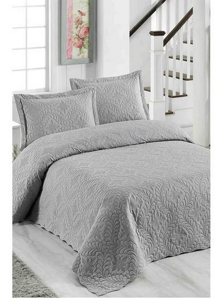 Gri renkte, nakışlı desenli yatak örtüsü, kumaş üzerinde dokulu detaylar sunar ve yatak odasına zarif bir görünüm katar.