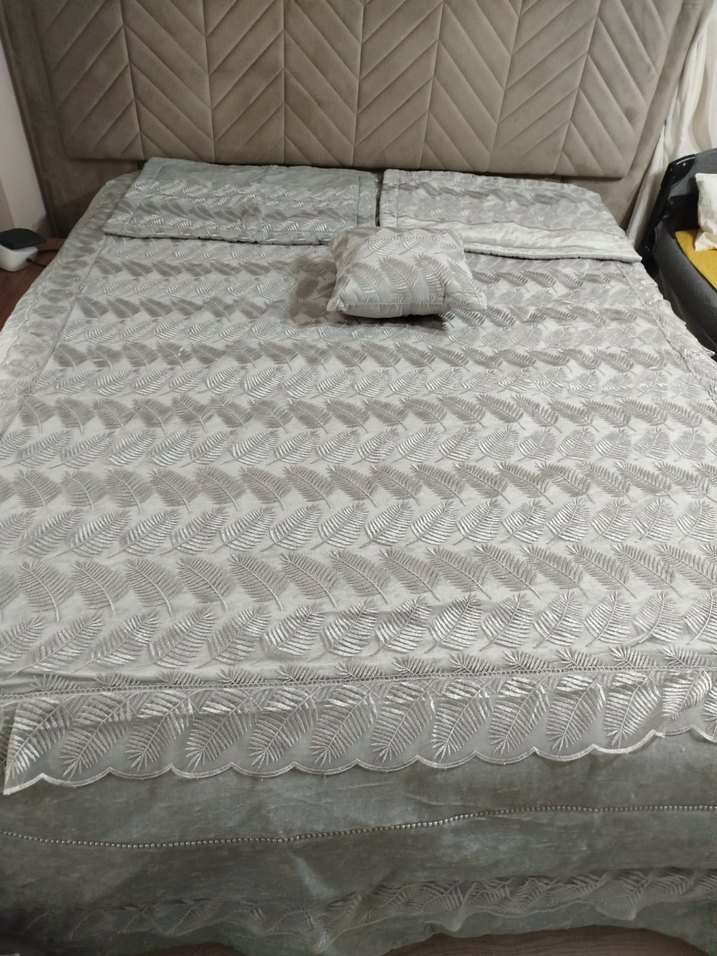 Gri nakışlı desenli ve dokulu kumaşa sahip yatak örtüsü, yatağa zarif bir dokunuş katar.