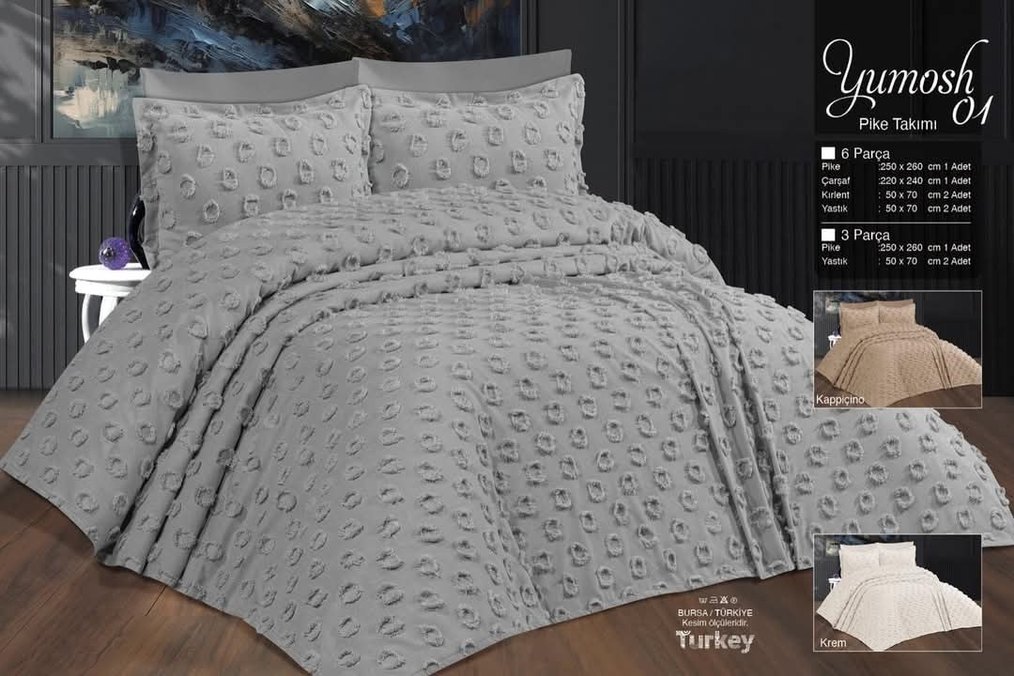 Gri renkte, nakışlı desenli yatak örtüsü ve uyumlu yastık kılıflarından oluşur. Kumaş dokusu detaylıdır.