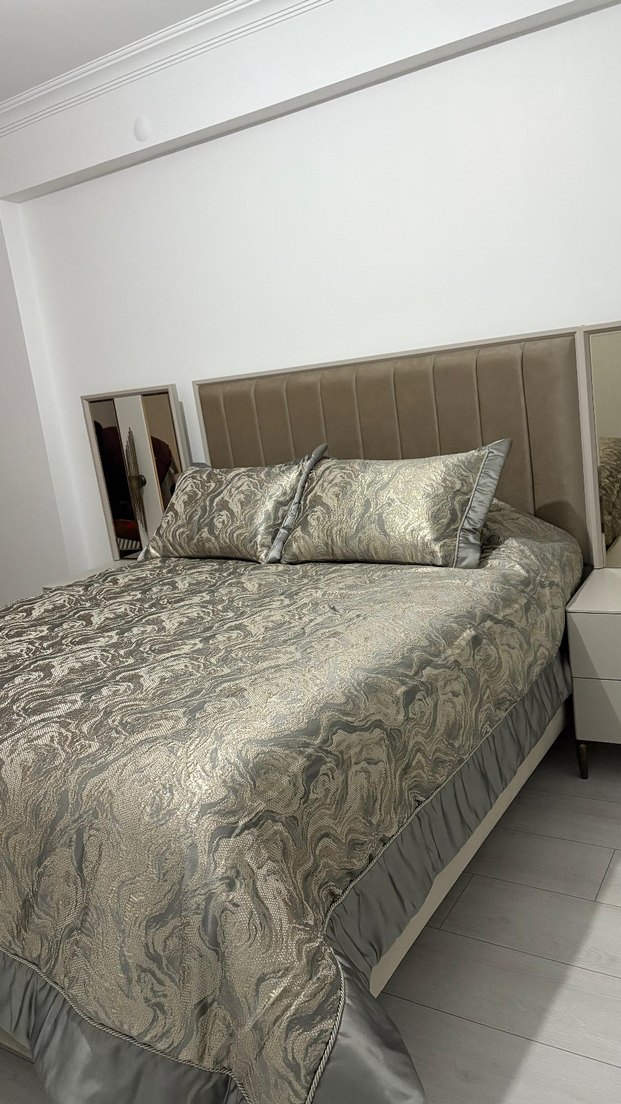 Gri renkli yatak örtüsü, zarif nakışlı deseni ve uyumlu yastık kılıfları ile yatak odasına şıklık katıyor. ️