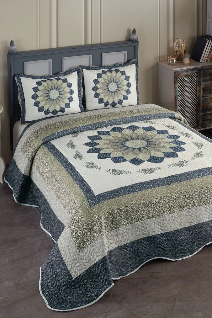 Gri renkli, nakışlı çiçek desenlerine sahip yatak örtüsü seti. Uyumu sağlayan yastık kılıfları ile birlikte gelir.