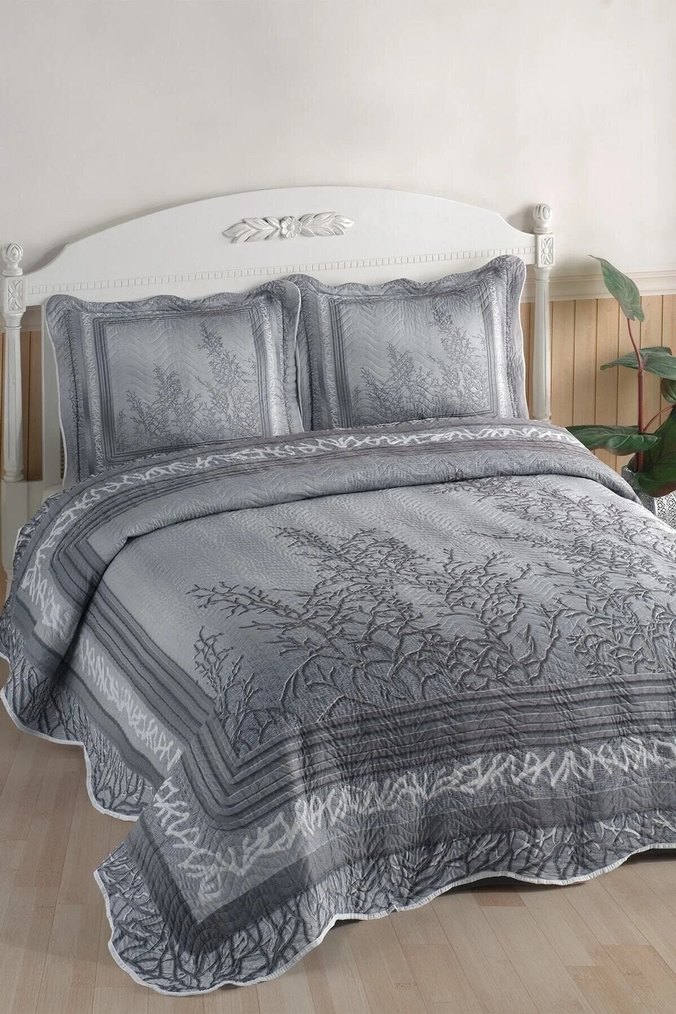 Gri renkli yatak örtüsü takımı, nakışlı desenlerle birlikte yumuşak dokulu ve şık bir görünüm sunar. ️