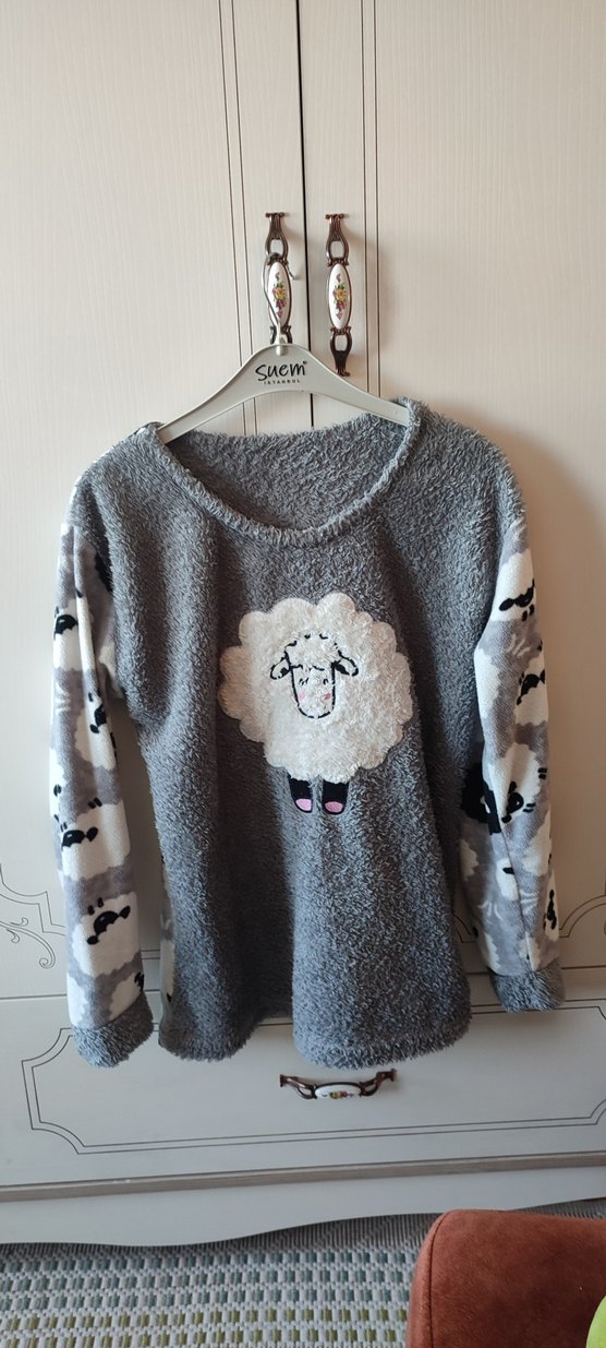 Yün malzemeden üretilmiş, nakışlı koyun desenli, uzun kollu ve yuvarlak yakalı pijama. Rahat kesimiyle günlük kullanıma uygundur.