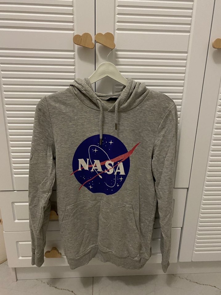 Gri renkte NASA baskılı, uzun kollu, kapüşonlu ve bol kesim kadın sweatshirt. Yumuşak kumaştan, ön cepli ve cırt cırt detaylıdır, rahat dış mekan kullanımı için uygundur.
