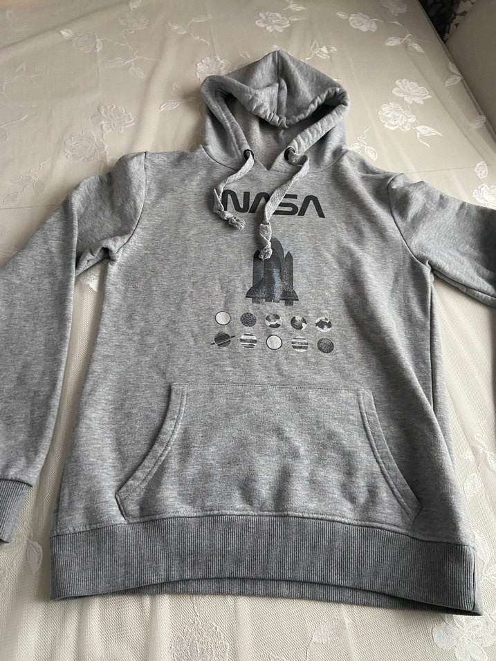 Gri renkte, uzun kollu ve fitted kesime sahip kadın sweatshirtü. Yumuşak ve sıcak kumaştan üretilmiş, NASA baskılı ve kanguru cepli. Dış mekan için uygun.
