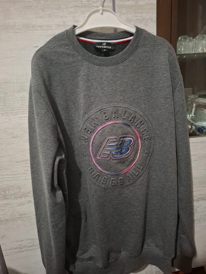 Gri New Balance sweatshirt, yuvarlak yaka ve uzun kolludur. Yumuşak fleece kumaştan, baskılı logo ve düğme detaylarına sahiptir. Spor ve rahat tarz için uygundur.