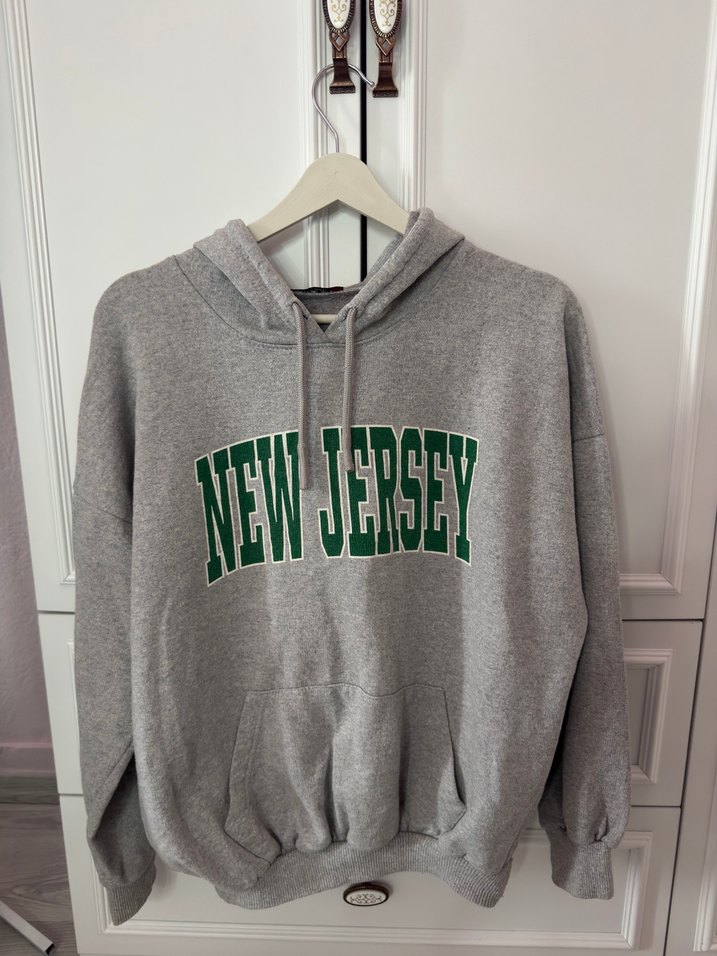 Gri New Jersey Baskılı Kapüşonlu Sweatshirt