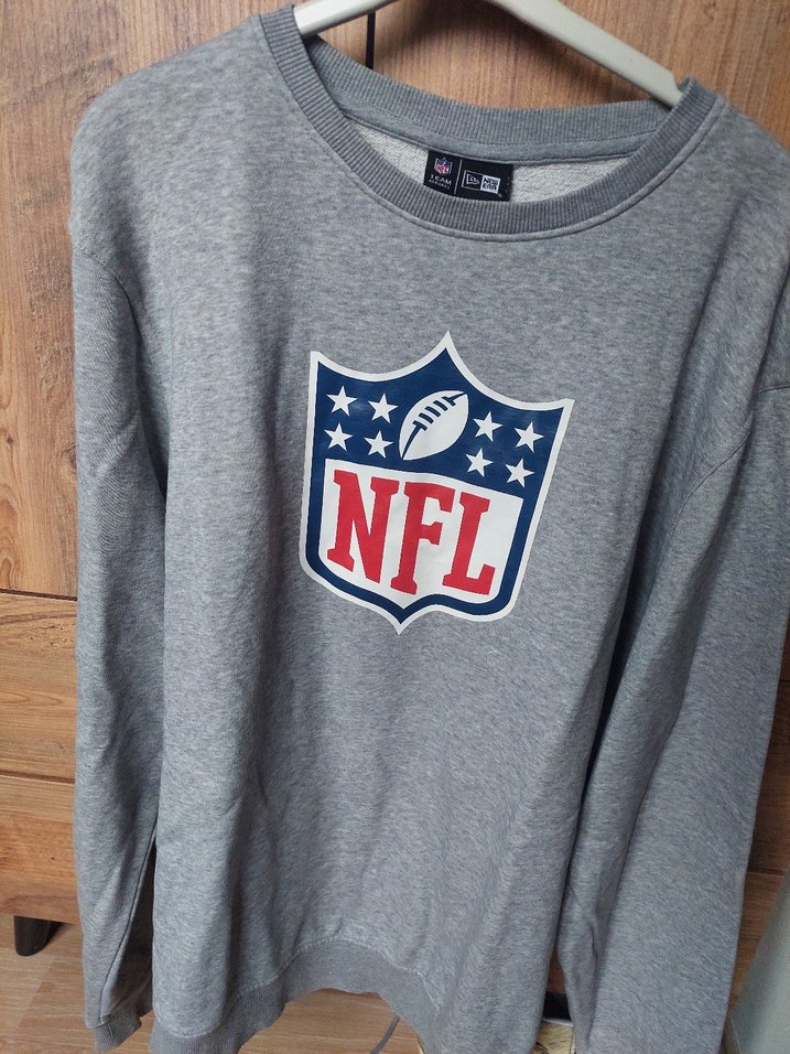 Gri renkte, uzun kollu ve yuvarlak yaka kadın sweatshirtü, önünde NFL baskısı bulunan yumuşak örme kumaştan, bol kesim ve normal boyda.