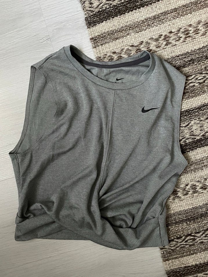 Gri Nike marka, kolsuz, rahat kesim ve yüksek yakalı atlet. Yumuşak keten kumaştan, spor ve sokak stili için uygun. ♀️
