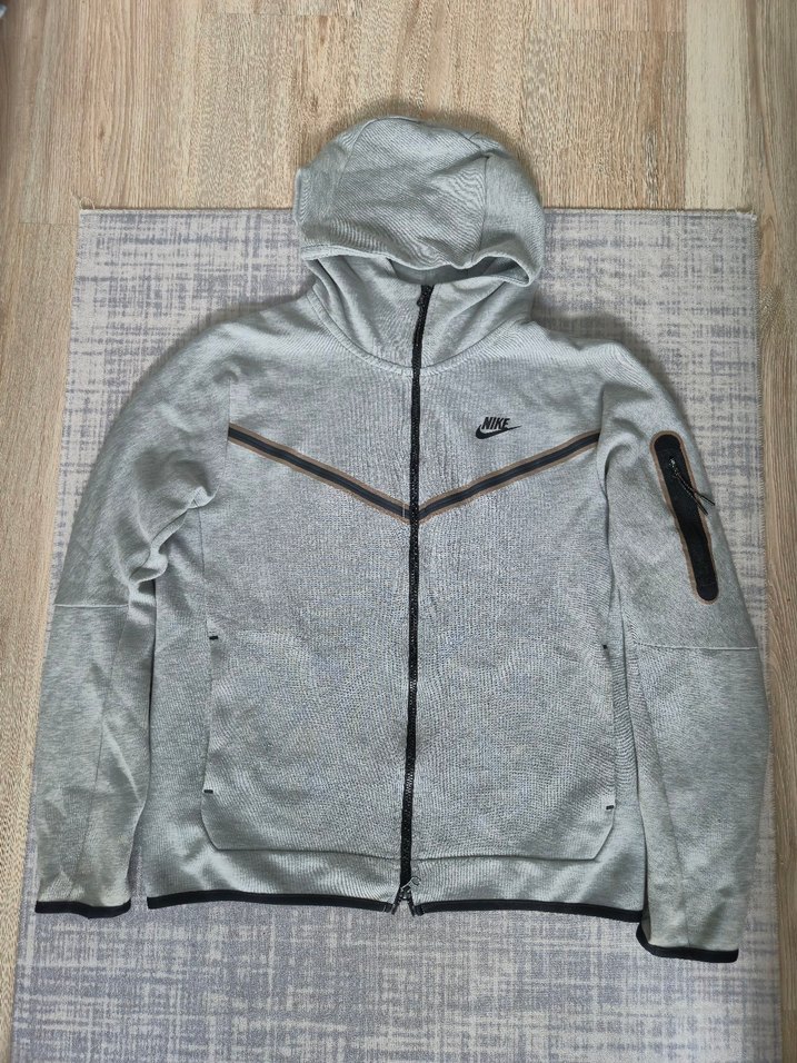 Gri Nike fermuarlı sweatshirt, uzun kollu ve dar kesim. Kapişonlu, kolunda fermuarlı cep bulunur. Dış mekan kullanımı için uygundur.