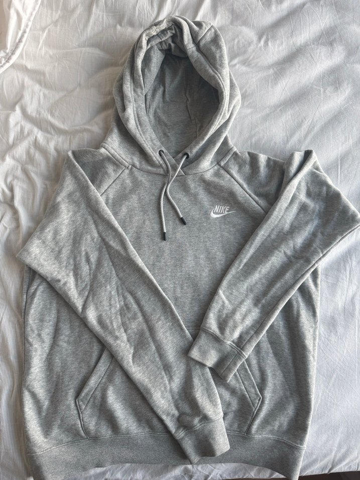 Gri Nike kapüşonlu sweatshirt, yüksek yakalı ve uzun kollu, yumuşak ve sıcak kumaştan. Rahat kesimi ve sokak stiliyle günlük kullanım için uygun.