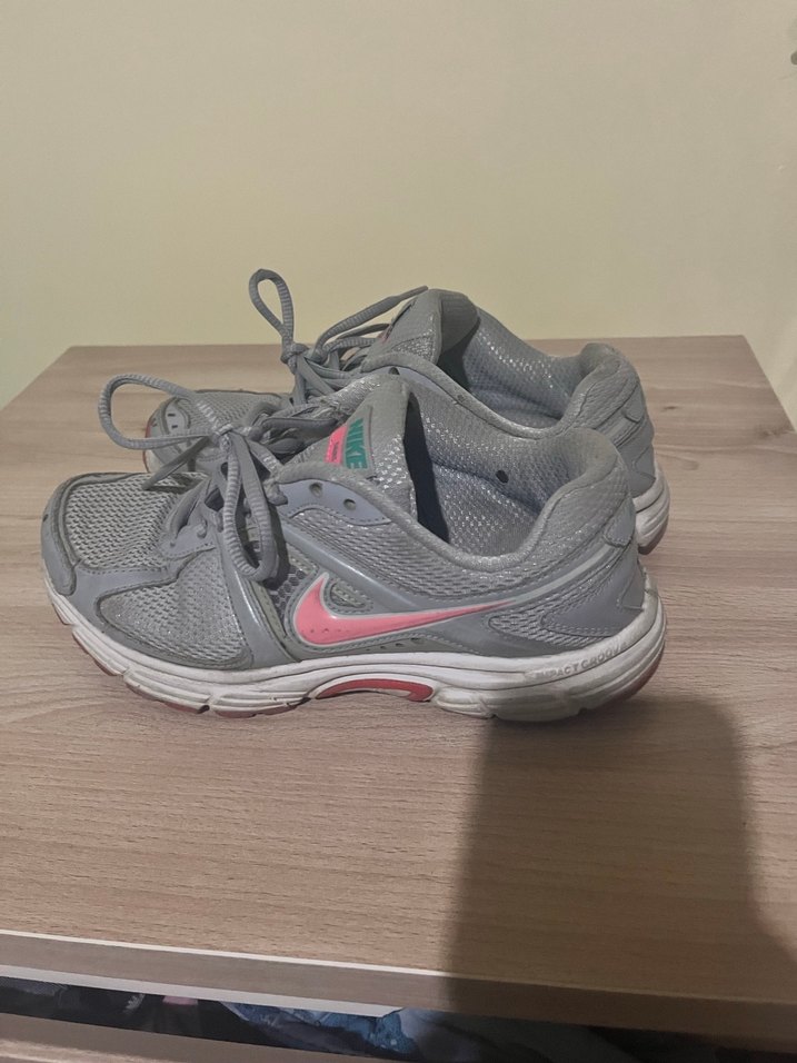 Gri Nike kadın spor ayakkabısı, bağcıklı ve kauçuk tabanlıdır. Spor ve rahat sokak stili için uygundur.