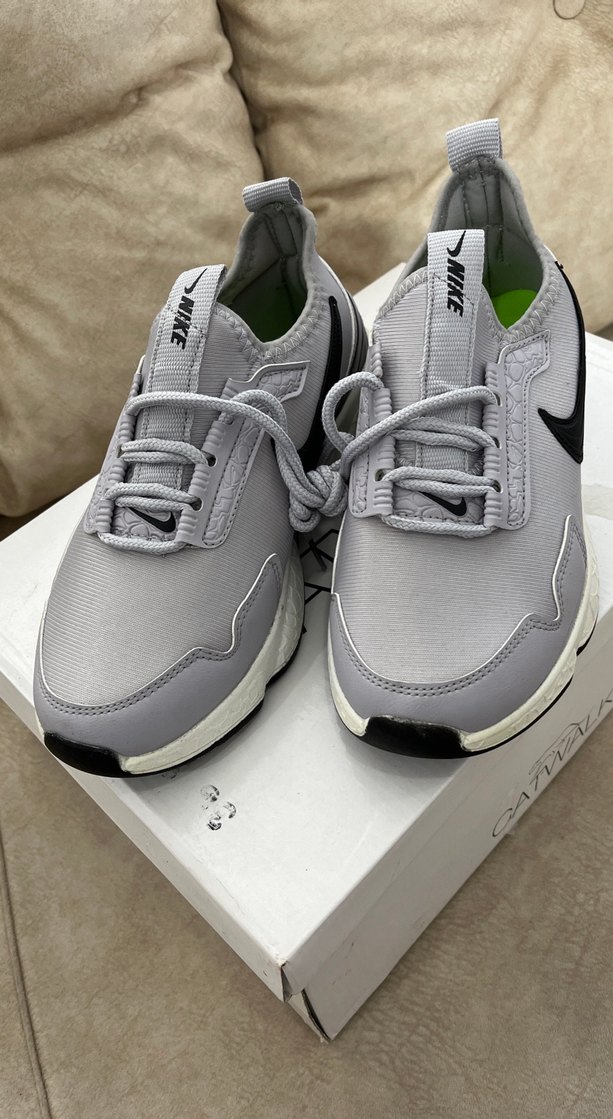 Gri renkte, bağcıklı tasarıma ve kauçuk tabana sahip Nike kadın spor sneakers. Sokak stili ile spor fonksiyonelliğini birleştirir, topuk stiletto tarzında.