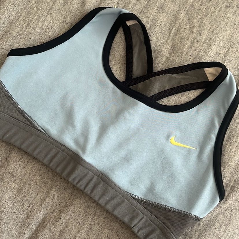 Siyah detaylı, sarı logolu gri Nike spor sütyeni, athleisure ve sokak tarzına uygun normal boyda.