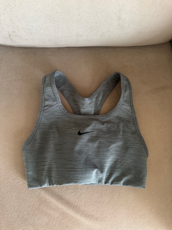 Gri Nike spor sütyeni, sırt kısmı racerback modelinde, desensiz ve rahat bir yapıya sahip, streetwear ve athleisure tarzına uygun. ️ 1 kez kullandım♀️
