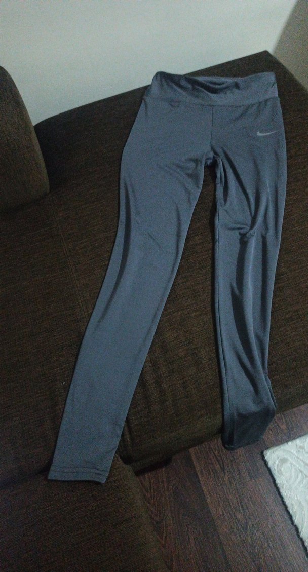 Gri renkli, dar kesim Nike tayt, orta boy uzunlukta ve yumuşak sentetik kumaştan, spor ve sokak giyimi için uygundur. ✨