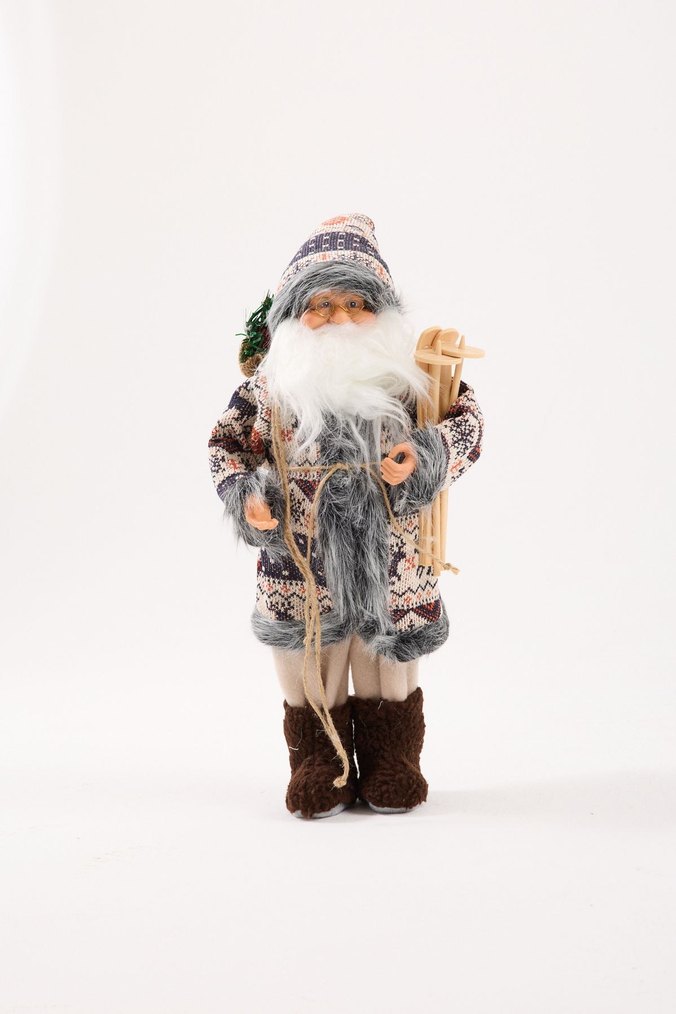 Gri renkli Noel Baba, desenli kıyafetler ve ahşap kayaklar taşır, beyaz sakalı ve kahverengi botları vardır, 45cm.boyu ,toplu alımda pazarlık payı vardır