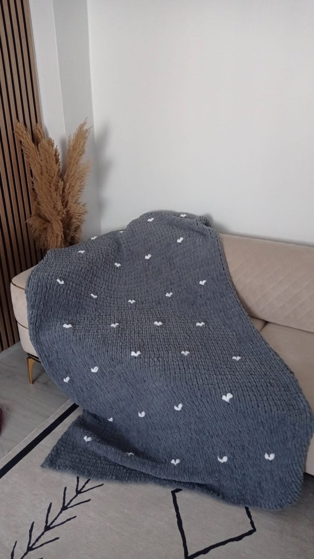 Küçük beyaz noktalarla süslenmiş yumuşak gri örgü battaniye, rahatlamak için ideal.