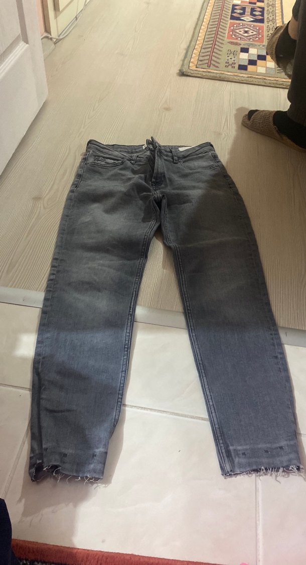 Gri renkli, normal boy ve regular fit denim kadın jean. Desensiz, günlük kullanıma uygun rahat ve şık tasarım.