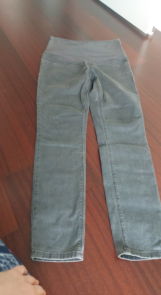 Gri hamile kot pantolon, normal boy ve regular kesim, kemerli bel detaylıdır. Günlük rahat kullanıma uygundur.