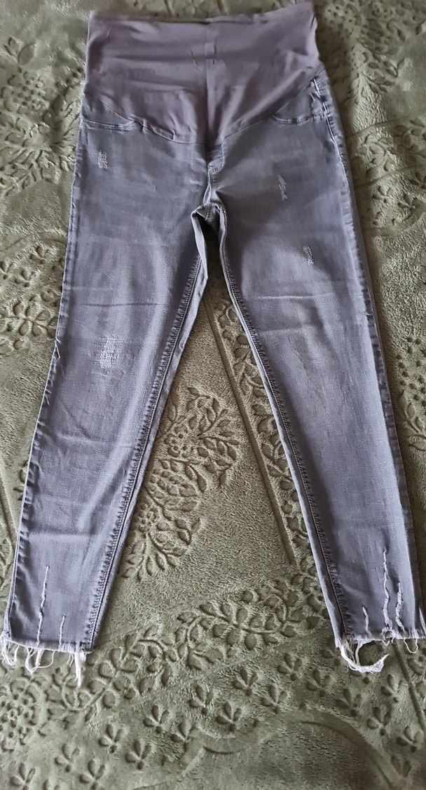Gri hamile kot pantolon, normal boy ve rahat kesim. Paça detayında yırtmaç bulunur, günlük kullanıma uygun sade bir model.