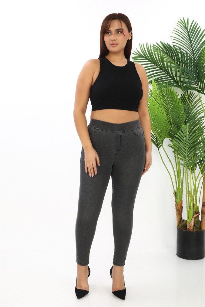 Gri renkte, normal boyda ve vücuda oturan denim tayt, gündelik kullanım için zahmetsiz şıklık sunar. belden lastikli ful likra özelliği korse etkisi 110 kg ya kadar uyumlu lütfen beden soralim