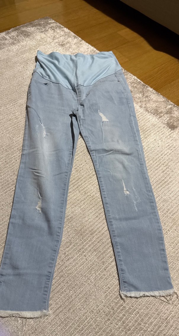 hamile kot pantolon, normal boy ve regular kesim. Rahatlık için esnek bel paneli ve yıpranmış detaylara sahip. Tokalı tasarımı vardır.