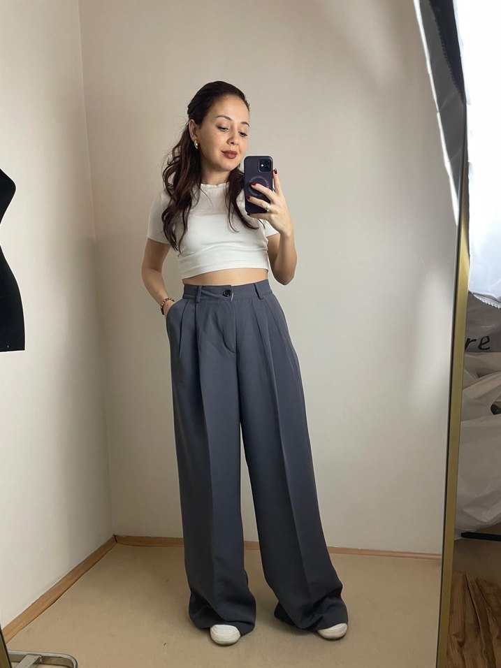 Gri renkli, normal paça ve midi boy kadın denim pantolon, rahat kesimiyle ofis için şık ve sade bir tercih sunar. Desensiz tasarımıyla zahmetsiz şıklık sağlar.