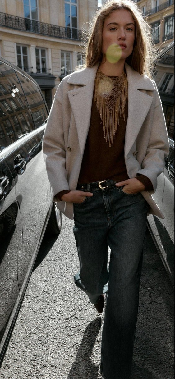 Gri kot kumaştan yapılmış, notç yaka ve uzun kollu, bol kesim midi uzunluğunda kadın kaban. Tokalı detayı ile günlük kullanıma uygundur.