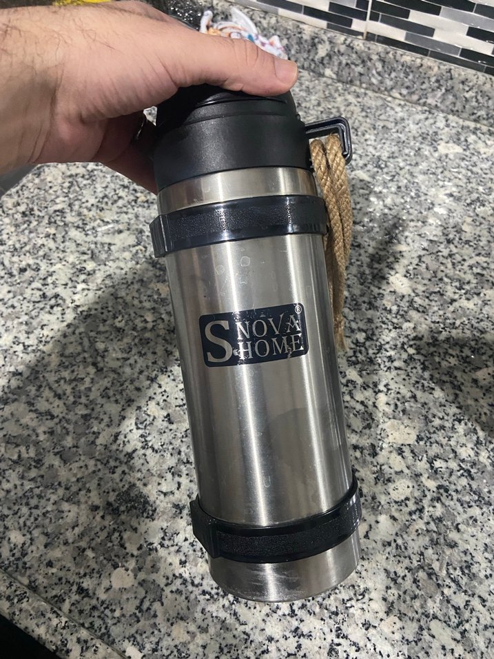 Gri Nove çelik termos matara, içecekleri sıcak tutar ve güvenli kapak ile kullanışlı taşıma askısına sahiptir. Çocuklar için uygundur.