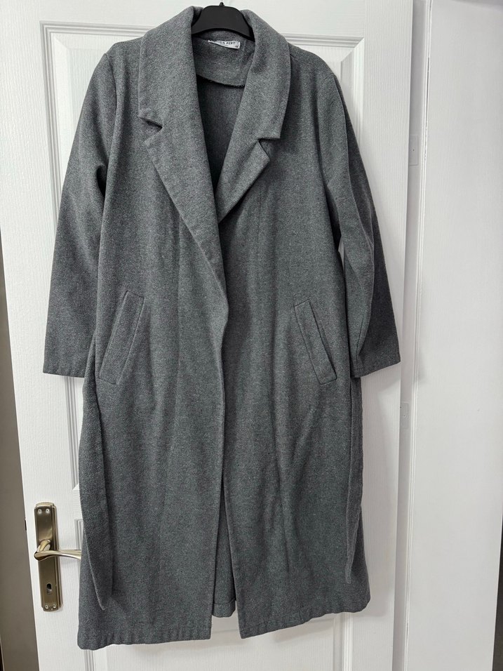 Gri önden bağlamalı uzun kaşe mont, boyu 116cm