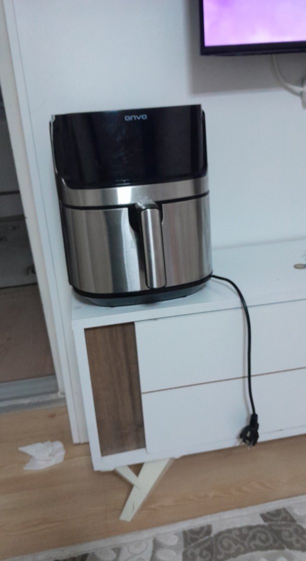 Onvo markalı gri renkli, paslanmaz çelik görünümlü havalı fritöz, ön tutma sapı ve kompakt tasarıma sahiptir. Elektrik bağlantısı için kablolu.ekran açılmıyor arızalı olabilir