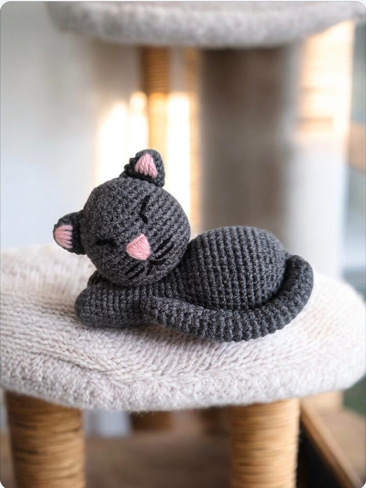 Gri renkte, kıvrılmış pozisyonda amigurumi kedi oyuncak. uzunluk 12cm, en 6cm, yükseklik 8cm