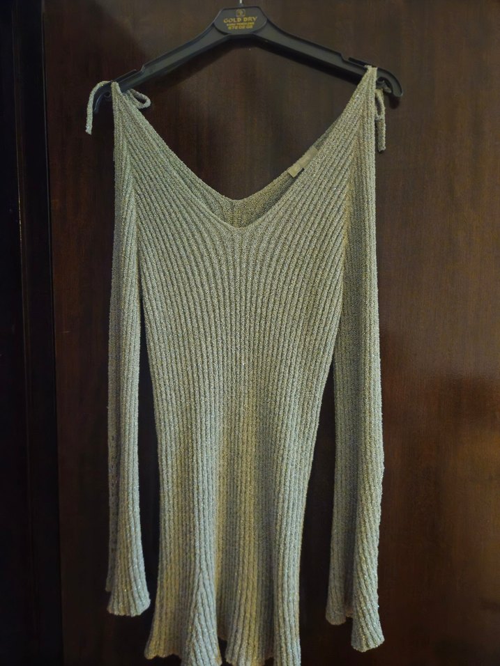 Gri simli renkli, askılı, örgü kazak Salaş kesim ve yumuşak dokusu ile bohem tarzı yansıtıyor.çok çok az kullanılmış , kolsuz ve rahat bir kullanım şık kazak..