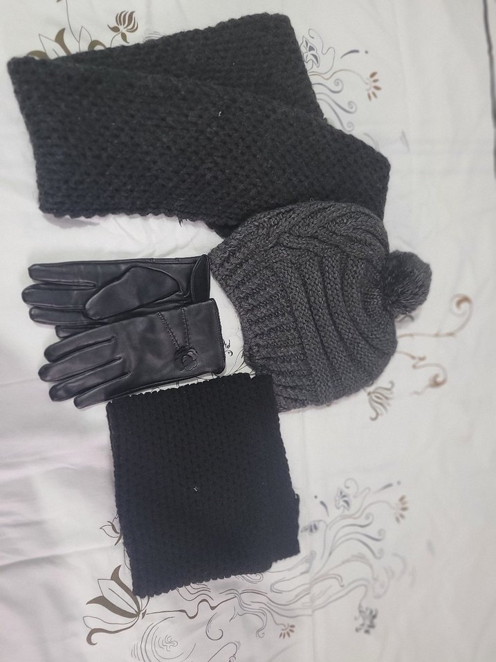 Yumuşak örgü kumaştan yapılmış gri kadın şapka atkı eldiven yedek boyunluk yeni takım halinde