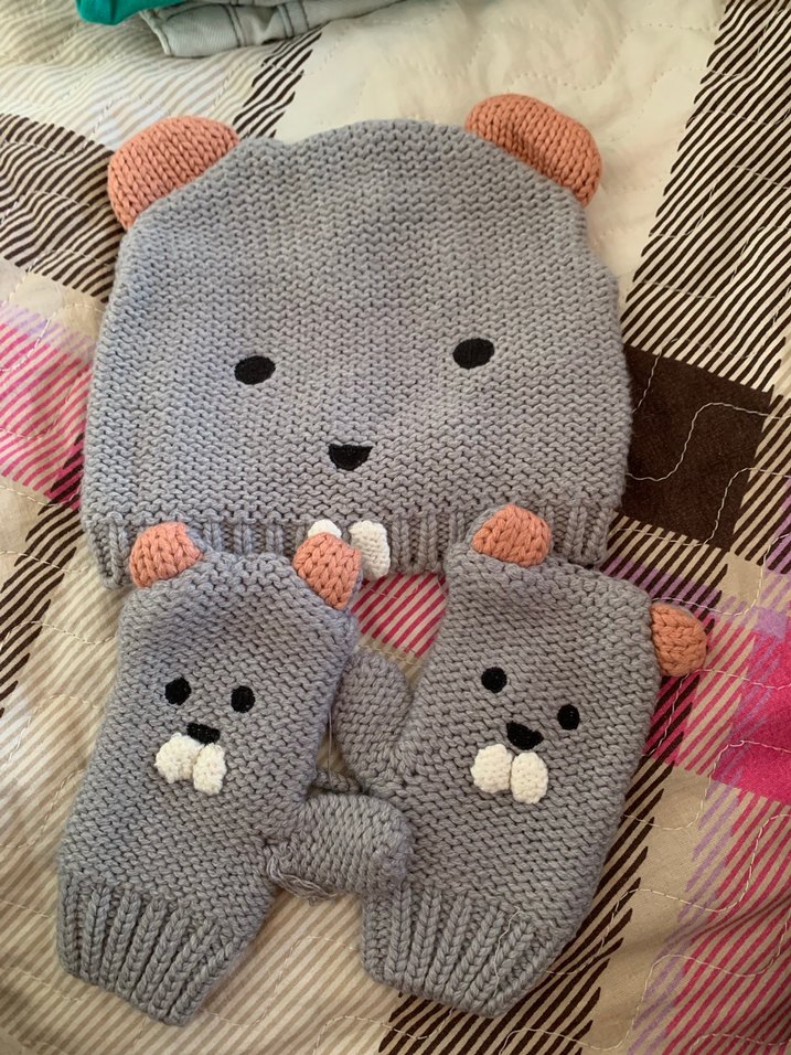 Gri örgü bere ve eldiven seti, üzerinde işlenmiş ayıcık yüzü ve kulakları bulunur, çocuklar için uygundur.