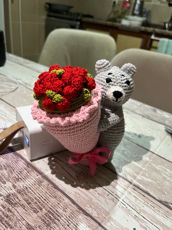 Gri örgü ayıcık, kırmızı örgü çiçek buketini pembe örgüyle sarıyor ve pembe kurdeleyle bağlanmış. Yumuşak, el yapımı peluş oyuncak.