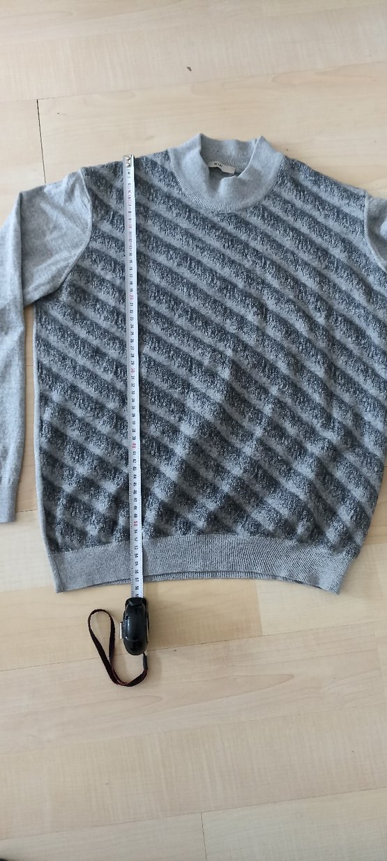 Gri örgü, yuvarlak yaka ve uzun kollu, rahat kesimdir. Normal midi boyda ve hafif çapraz dokulu desene sahiptir, günlük kullanım için uygundur.