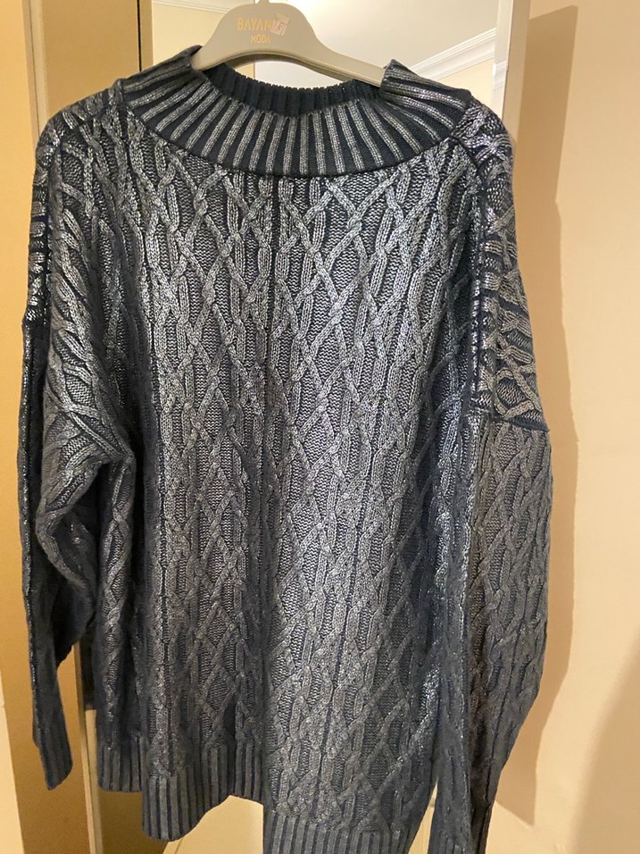 Gri renkli, örgü dokulu, balıkçı yaka ve bol kesim kadın kazak. Uzun kollu ve midi boyda, günlük kullanıma uygun gotik tarzda rahat bir parça.