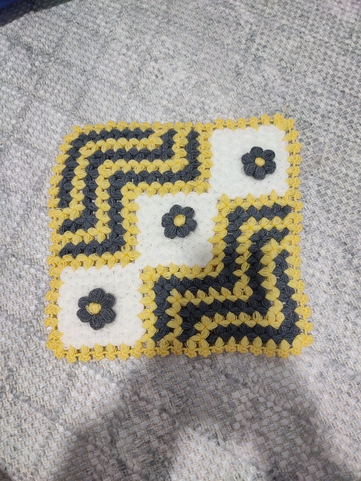 Sarı kenarlıklı, çiçek desenli gri örgü banyo süngeri, el yapımı, sıfır ürün
