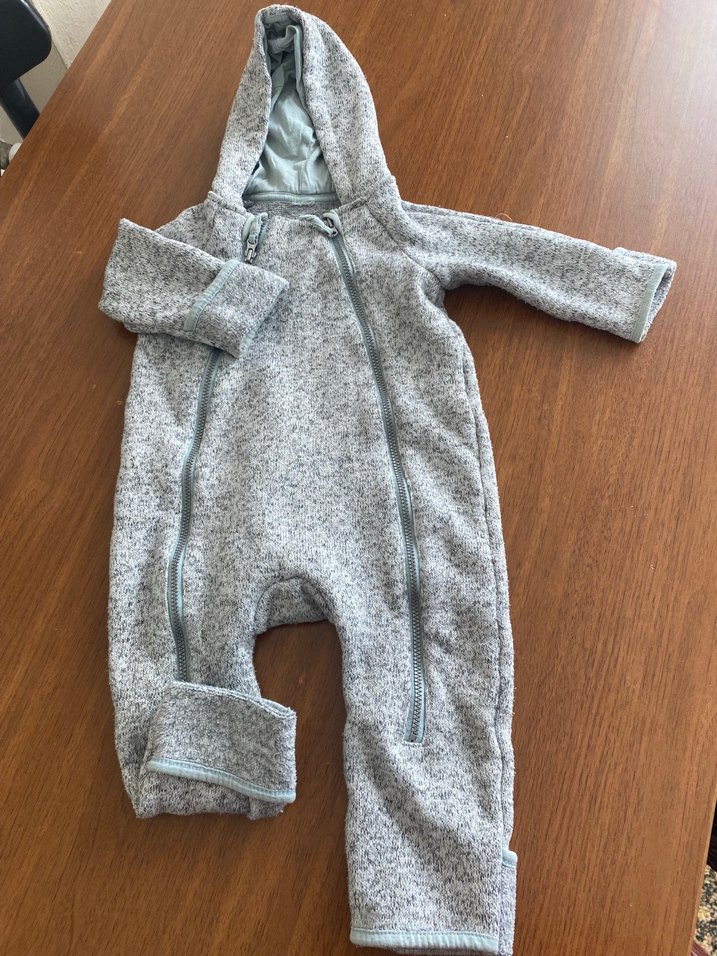 Gri renkli, örgü yapıda, kapüşonlu ve çift fermuarlı bebek erkek tulumu, yumuşak ve sıcak kumaştan üretilmiştir.