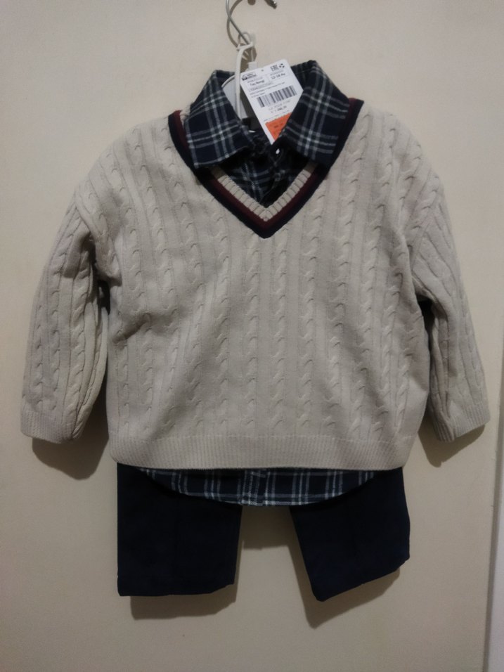 Gri örgü uzun kollu kazak ve ekose gömlek ile kombinlenmiş, koyu renk pantolonlu bebek erkek takımı. Yumuşak ve rahat dokulu, sokak tarzı için uygun.