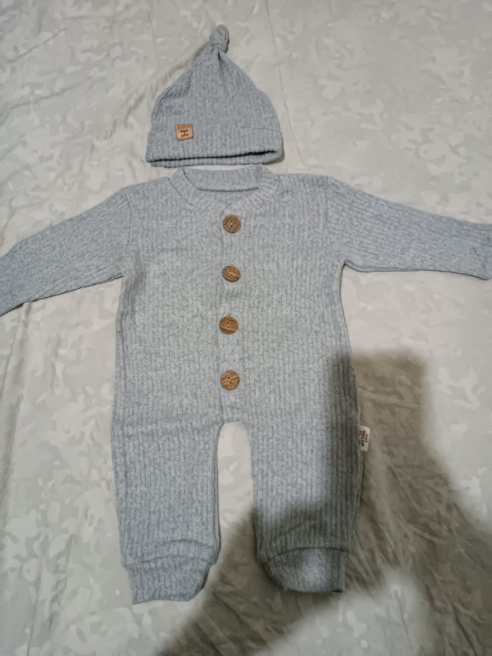 Gri örgü kumaştan yapılmış uzun kollu, boğazlı bebek erkek tulumu, ahşap düğmeler ve uyumlu düğümlü şapka ile tamamlanmıştır. Rahat ve yumuşak dokulu.