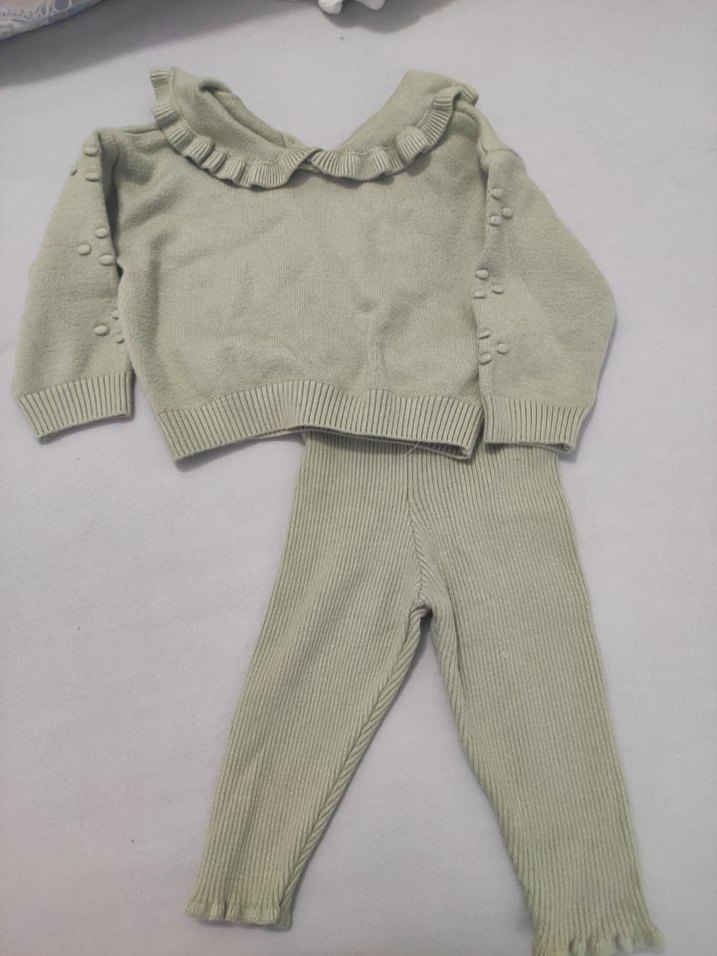 Uzun kollu, örgü gri bebek kız takımı. Fırfırlı yaka ve dokulu kollara sahip üst, ribana desenli tayt ile tamamlanmıştır.