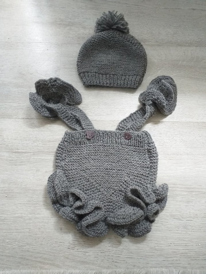 Gri örgü bebek kız tulum ve ponponlu şapkadan oluşan set. Yumuşak ve rahat malzeme.