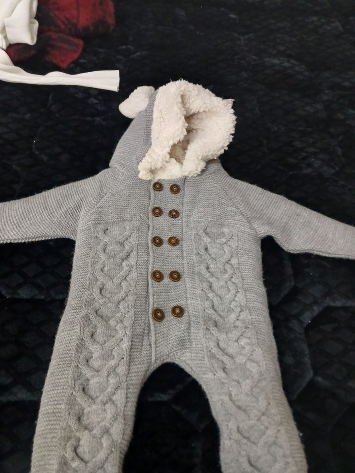 Gri renkli, işlemeli desenlere sahip örgü bebek tulumu, yumuşak kapüşon astarı ve çift sıra düğme detaylarıyla sıcak tutar.