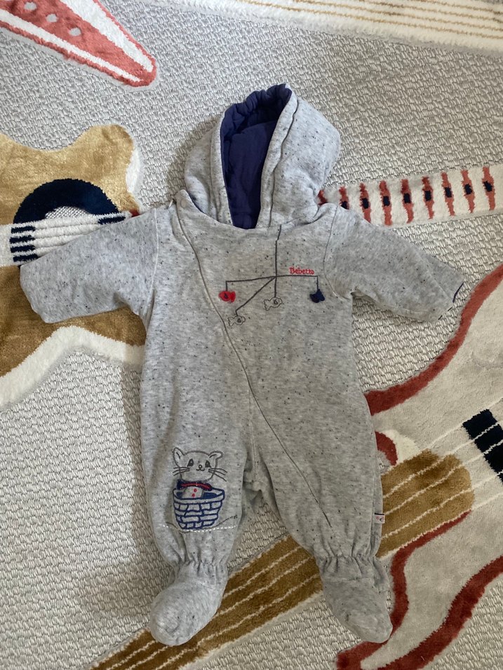 Gri renkli, örgü dokulu ve nakışlı bebek tulumu. Kapüşonlu ve ayaklı tasarımıyla sıcak tutar. Kalın biraz mont gibi