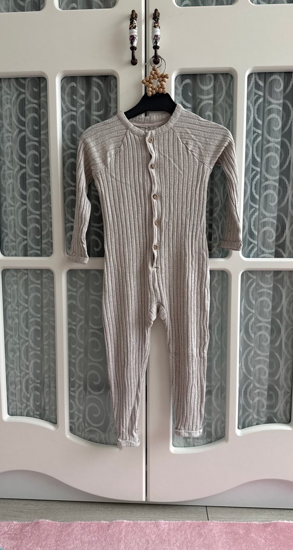 Uzun kollu, bisiklet yakalı gri örgü bebek tulumu. Önü düğmeli ve yumuşak örgü kumaştan yapılmıştır. Rahat kullanım için uygundur.