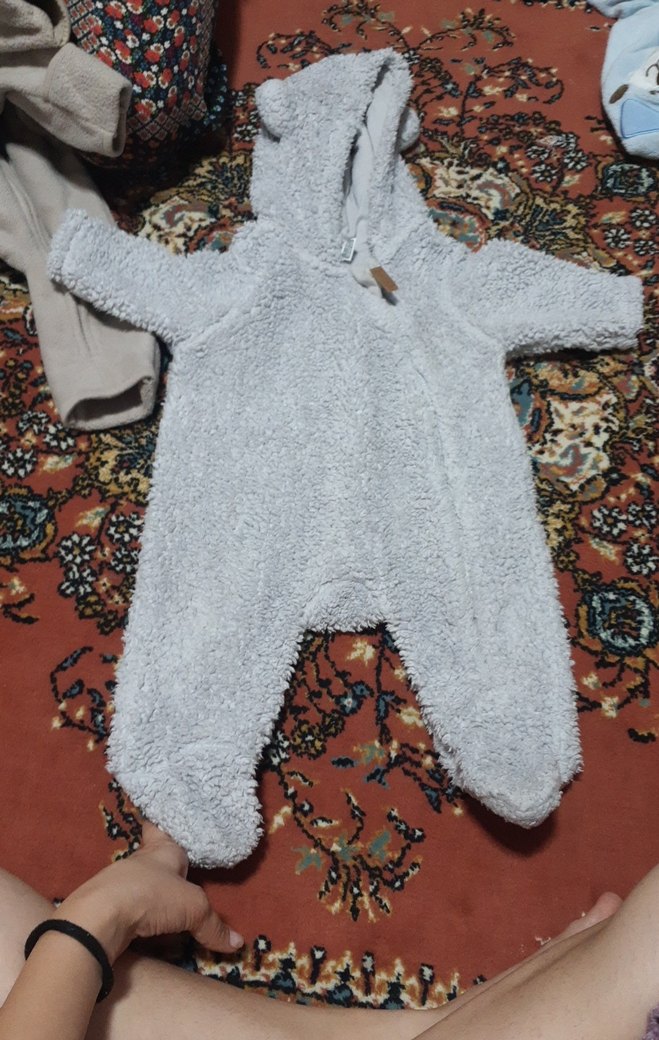 Gri renkte, kapüşonlu ve örgü dokulu yumuşak bebek tulumu. temiz kullanıldı