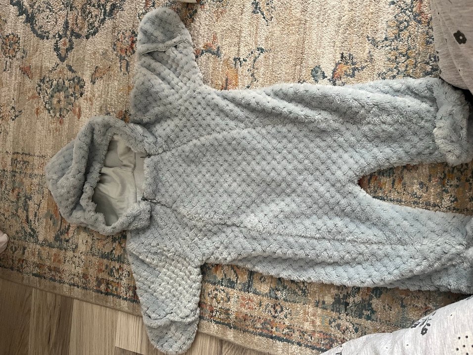 Gri renkli, örgü örme bebek tulumu, bohem tarzı ve yumuşak dokusuyla sıcak tutar. ❄️
